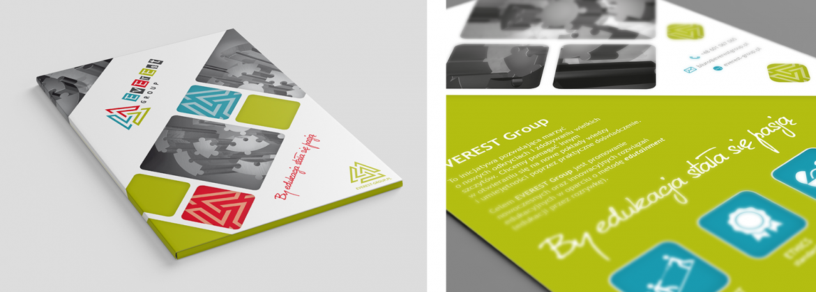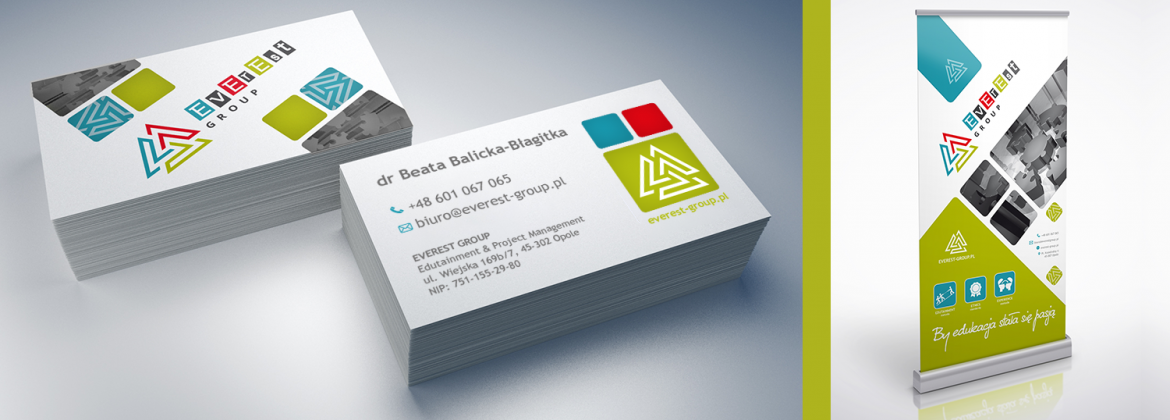 Dla EVEREST Group przygotowane zostały kompleksowe materiały graficzne i marketingowe – od logo przez wizytówki, papier firmowy, szablon prezentacji, ulotki, folder, mailingi, tablice reklamowe, roll-up oraz stronę www, filmy wizerunkowe, intra, aż do materiałów do pracy z interesariuszami. Wszystkie elementy layoutu określone zostały w księdze identyfikacji wizualnej.