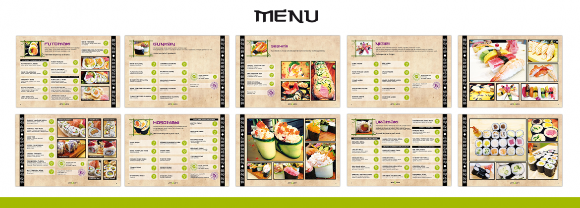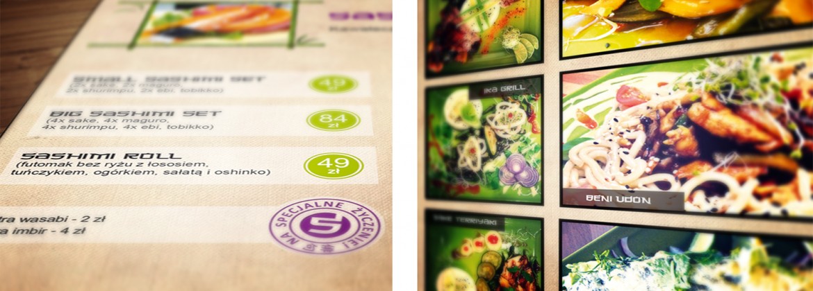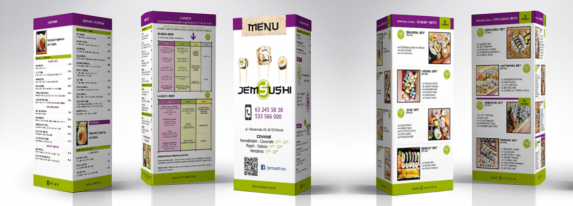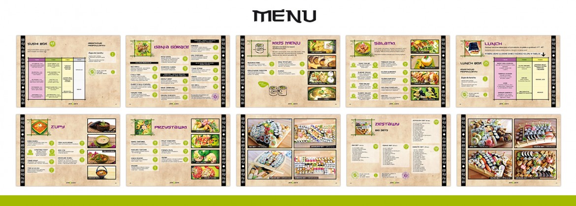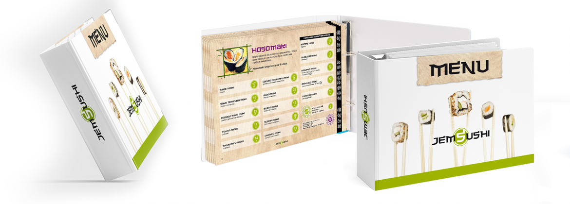 Dla Klienta zostało stworzone kompleksowe menu w postaci segregatora ze stylizowanymi kartami oraz rozkładana ulotka z ofertą firmy.